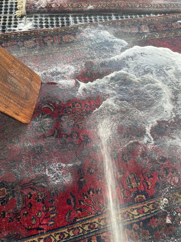 Next, a gentle soap and water solution is applied and whisked across the rug with soft brushes and brooms. Special attention is given to cleaning fringe, which is very delicate, but often the most soiled part of the rug.